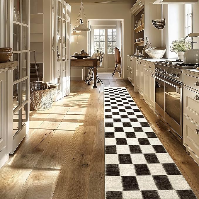 EVERGRACE Checkered Plaid Area Rug 2x10, Soft Fuzzy Faux Wool Rugs Washable Anti Slip Rugs Long Runner Rug Carpet for Entryway Bedroom Living Room Hallway Kitchen Dining Room and Laundry Room, Black