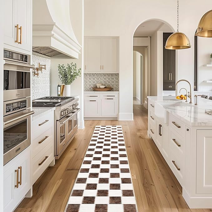 EVERGRACE Checkered Plaid Area Rug 2x10, Soft Fuzzy Faux Wool Rugs Washable Anti Slip Rugs Long Runner Carpet for Entryway Bedroom Living Room Hallway Kitchen Dining Room and Laundry, Dark Brown
