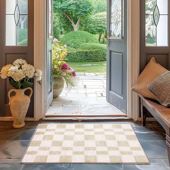 EVERGRACE Checkered Plaid Area Rug 2x3, Soft Fuzzy Faux Wool Rugs Washable Anti Slip Rugs Small Rug Carpet for Entryway Bedroom Living Room Hallway Kitchen Dining Room and Laundry Room, Beige