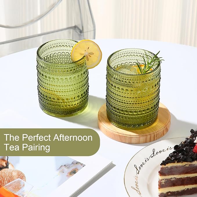 Vintage Glassware Drinking Glasses Set of 6,12 oz Hobnail Glass Cups,Embossed Green Water Tumbler,for Beer,Cocktail,Whiskey,Juice and Various Mixed Drinks- 1 Cleaning Brush