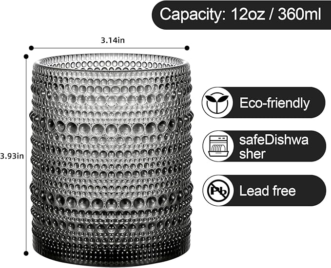 Vintage Glassware Drinking Glasses Set of 6,12 oz Hobnail Glass Cups,Embossed Grey Water Tumbler,for Beer,Cocktail,Whiskey,Juice and Various Mixed Drinks- 1 Cleaning Brush