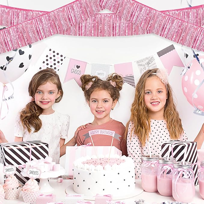 12 Pack 10 Feet Metallic Foil Fringe Garland Tinsel Streamers Banner, Pink Wall Hanging Tinsel Fringe Banners for Parade Floats, Wedding, Birthday, Christmas, New Year Party Decorations