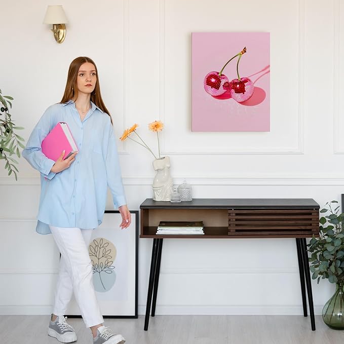 APJYM Trendy Hot Pink Disco Ball Cherry Wall Art, Preppy Room Decor, Y2K Room Decor, Funky Y2K Aesthetic Wall Art for Girls Bedroom Dorm Apartment, 11x14 Inches Frame