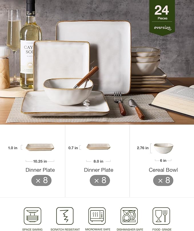 Famiware Dinnerware Sets for 8, Ocean Square 24-Piece Kitchen Plates and Bowls Sets, Microwave and Dishwasher Safe, Scratch Resistant, Cappuccino White