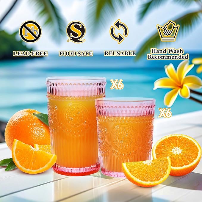 12pcs Vintage Drinking Glasses Set, 12 oz Highball Glasses & 9 oz Embossed Ribbed Glassware Cups for Cocktail, Water, Juice, Coffee, Whiskey (Pink)