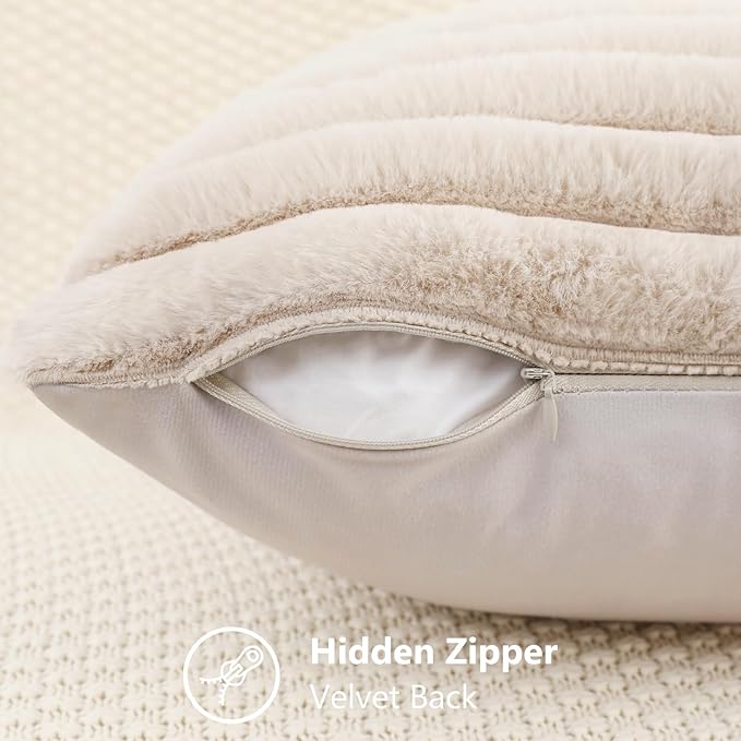 decorUhome Faux Fur Throw Pillow Covers 16x16 Set of 2, Decorative Soft Plush Striped Neutral Euro Pillow Covers with Velvet Back for Bed, Living Room Home Decor, Beige