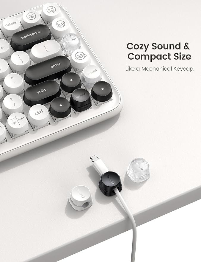 - Compact & Keep Cords Neatly : Size: 0.85" X 0.85" X 0.55", Weight: 3g. Our spring cord organzier holder clips is designed with a small and exquisite look like a mechanical keyboard round keycaps, allowing to be firmly fixed in most narrow spaces. Coming with 6 individual cable organizer, you can keep cables toward neat traces as you wish while setting them on office desktop, nightstand, tableside, table corner, wall or car, etc, desk supplies, desktop accessories