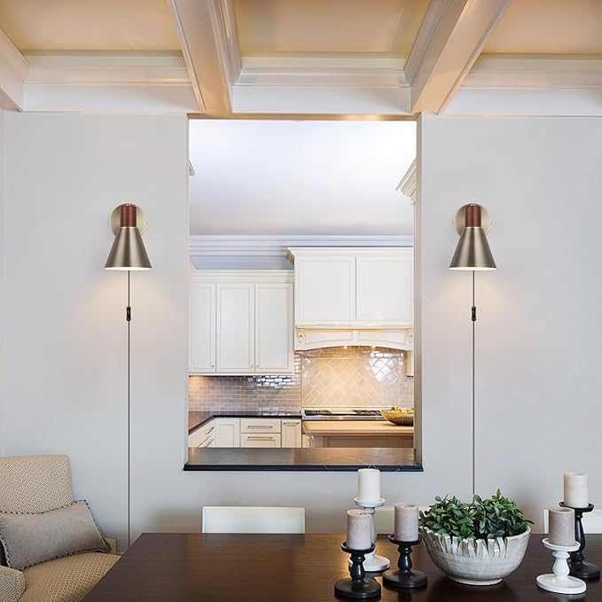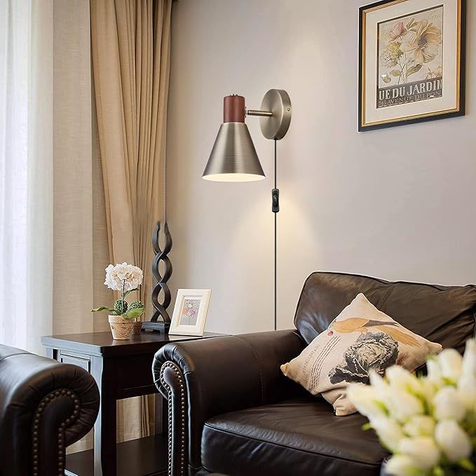 Plug in Wall Sconces Lighting Fixture Pack of 2, Vintage Brass Wooden Adjustable Bedside Wall lamp for Industrial Bedroom, Bathroom Sink Lighting (Plug-in Vintage Brass, 2)