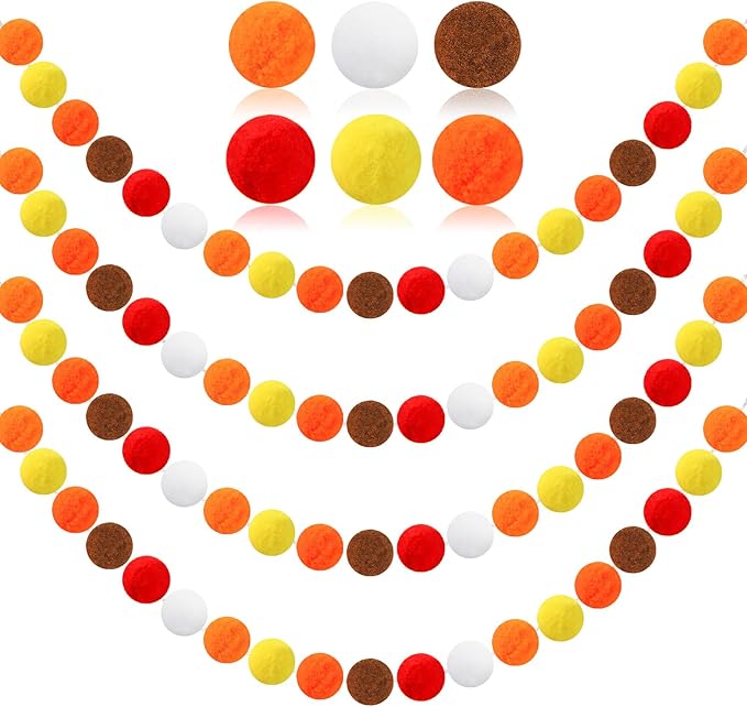 MARFOREVER 4 Pack 26.3 Ft Fall Pom Pom Garlands, Thanksgiving 30 Balls Oange Yellow Fall Felt Ball Garlands Decorations for Autumn Harvest Thanksgiving Day Party Home Classroom Hanging Decor Supplies