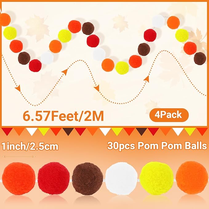 - Package Content: You will receive 4 strings 2 meters Thanksgiving garland, each consisting of 30 pom pom balls, with a length of 6.57 feet/2 meters, total in 26.5 feet. The quantity and length are enough to meet your different decoration needs, and you can hang the fall pom poms anywhere you want, which is an ideal choice for you to add autumn flavor and home decoration