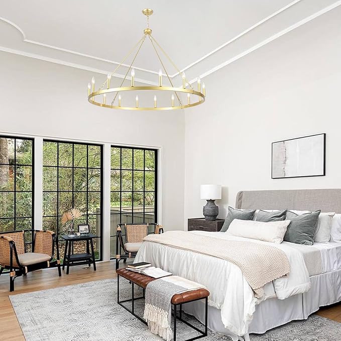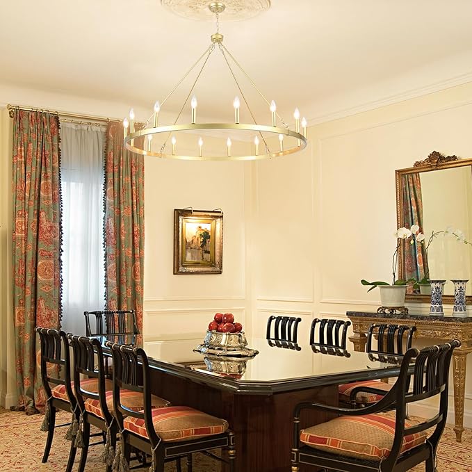 - 【Elegant Design】This large chandelier has a gold wagon wheel style and is made of steel with exquisite craftsmanship and strong durability. 16 candle-shaped lamp holders perched on golden wheels, perfect for high ceilings chandeliers and large Spaces lighting fixtures!
