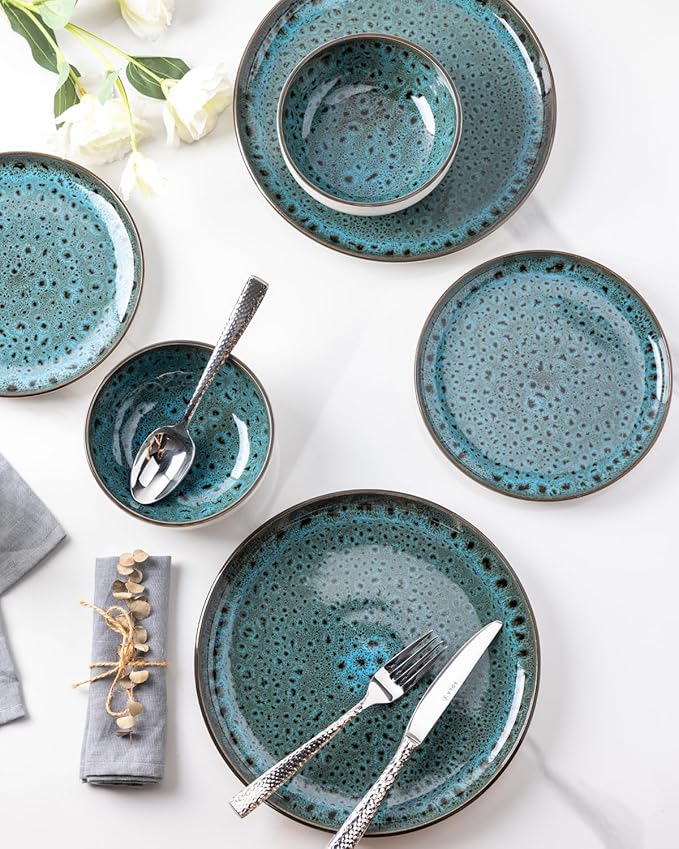 - 【EAT SAFTY】Our stoneware plates and bowls sets are made from natural materials and fired under 2300℉ high temperature for about 17 hours, ensuring that they are completely safe and non-toxic. Each one is adorned with an all-natural glaze that ensures they are lead-free and cadmium-free and do no harm to your family. This dinnerware set is 100% MICROWAVE, DISHWASHER, and FREEZER SAFE.