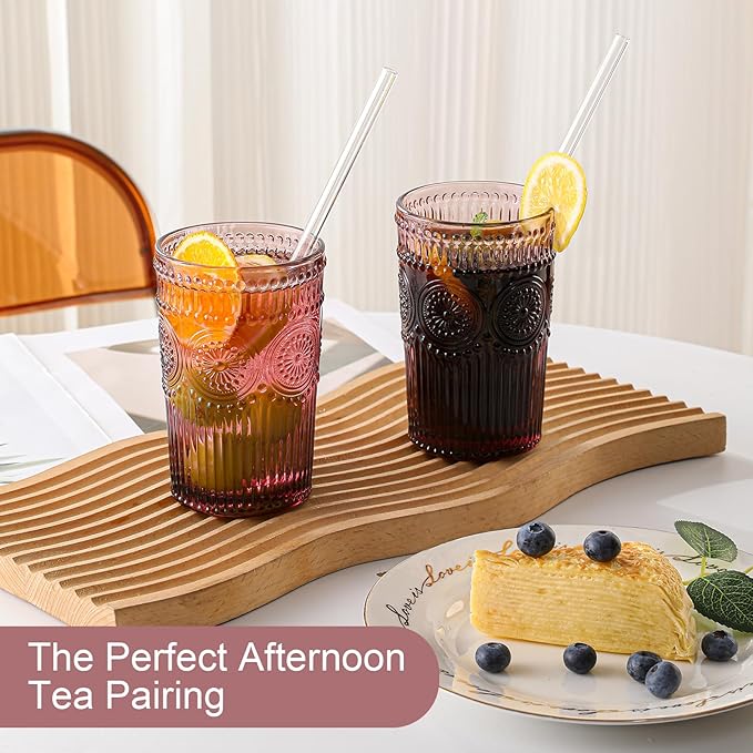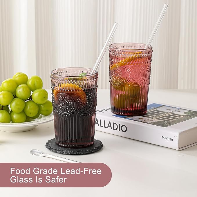 Vintage Glassware Drinking Glasses Set of 6,13 oz Purple Textured Flower Design Glass Water Tumblers,Embossed Striped Drinkware for Water,Cocktails,Juice,Iced Coffee