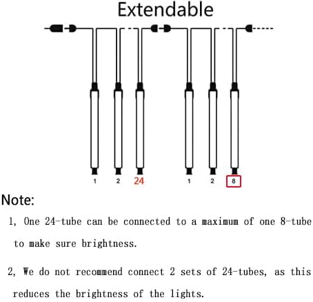 - 【Connectable with Purtuemy 8-tube Ones】24-tube meteor lights can connect with Purtuemy 8-tube purple meteor lights(search for B0CB5PZ5Y9 on Amazon), which has a decorative range of 9 feet. 24-tube and 8-tube work together would have a more flexible range of decoration. But we suggest don’t connect two 24-tube ones together(, and one 24-tube can connect with only one 8-tube to ensure the brightness of the light show. PS: If you don't need such a long lights, you can order our 8-tube ones