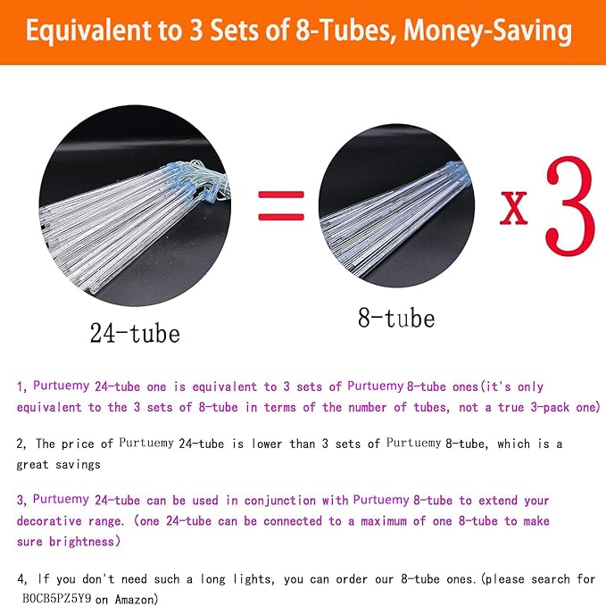 - 【Equivalent to 3 Sets of 8-Tubes, Money-saving】Our 24-tube meteor shower orange lights has 24 tubes, which is equivalent to 3 sets of Purtuemy 8-tube meteor shower orange lights in decorative effect, but the price is lower than 3 sets of 8-tube, which is a great savings. Note: they are only equivalent to the 3 sets of 8-tube in terms of the number of tubes, not a true 3-pack