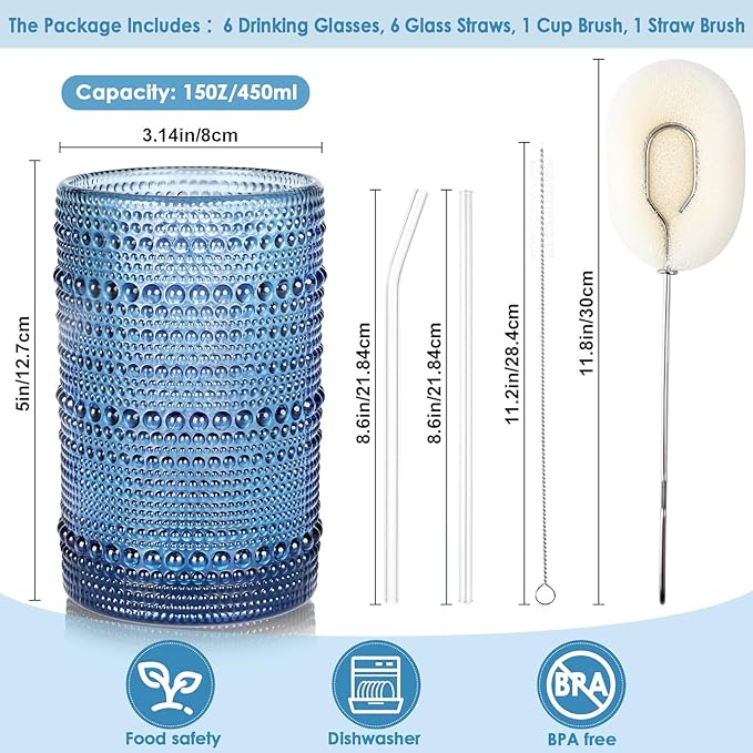 - PACKAGE DETAILS: Includes 6 450ml exquisite cornflower blue water glasses, 6 glass straws,1 cup brush,1 straw brush.Cups are dishwasher-safe and come out sparkling clean without losing their shine or pattern.