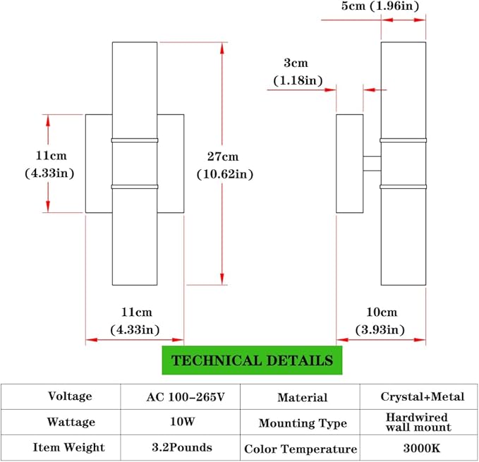 - Warm White LED & Compact Design: Features an integrated, energy-efficient 10W LED source emitting a comfortable 3000K warm white glow (1900 Lumens). Compact profile: Height 10.62in, Width 1.96in, Projects 3.93in from the wall