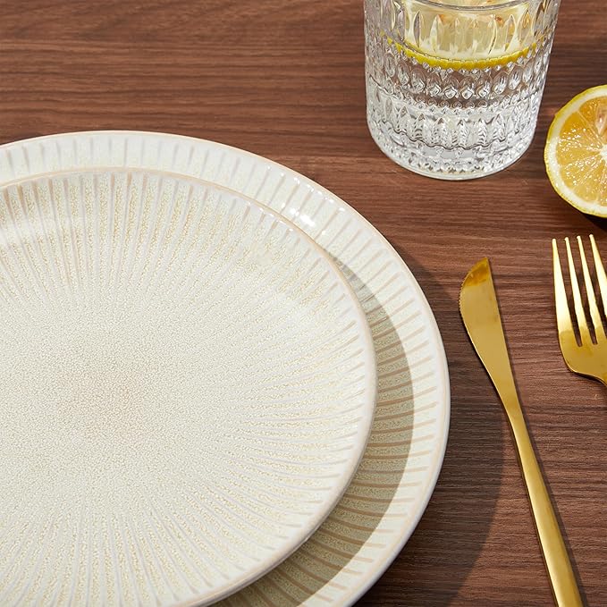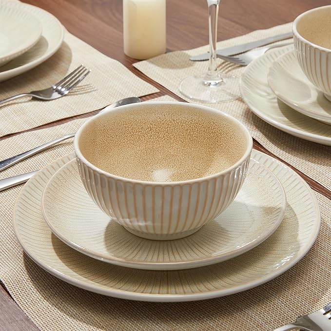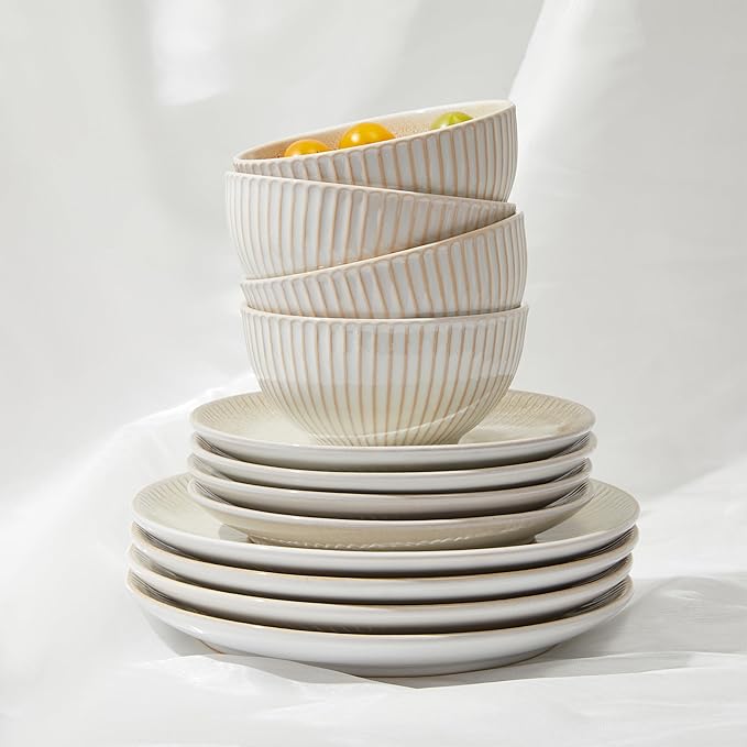 - UNIQUE MODERN DESIGN-Our 12-piece ceramic dinnerware set features a modern and elegant embossment design, allowing your dinner set to be the star of the table. Pebble-like textured glaze, which look ultra classy and beautiful. This plate and bowl set is durable enough for everyday use for the family, yet sophisticated enough for that important dinner party or special event. Perfect for wedding and housewarming gifts