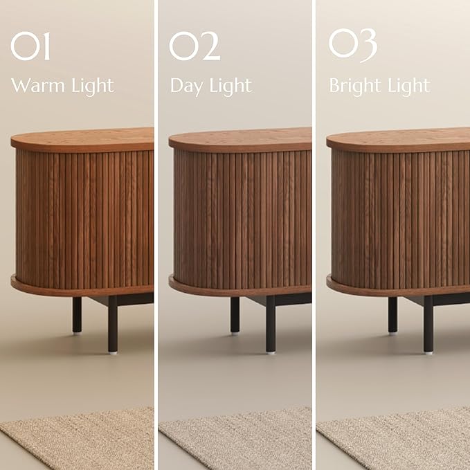 - Sleek Curve Round Edge: The smooth curved round edge tv stand with storage, rolling slatted door solid wood tv console, soften the look of the streamlined frame, provide an environment safe for the little ones. Its aesthetic appeal makes it suitable for both living rooms and bedroom
