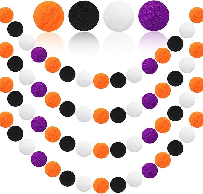 - Package Content: You will receive 4 PCS 2m Halloween pom pom garland, each consistence of 30 POM POM balls, with a length of 6.57 feet/2 M, total in 26.5 feet. The length and quantity are enough to meet your diversified decorative needs, and Halloween garland decor is the ideal choice for party decoration and home decoration