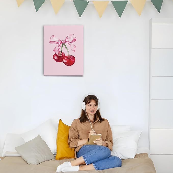 APJYM Coquette Pink Bow Cherry Preppy Wall Art, Room Decor Aesthetic, Posters for Teen Girls Bedroom, 11x14 Inches Framed