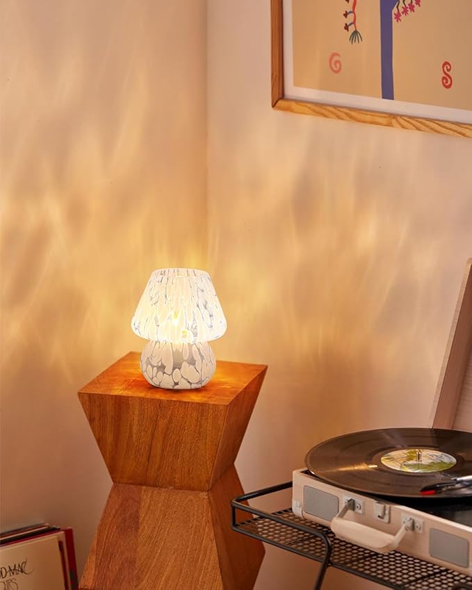 - 【Murano Style Glass Lamp】ONEWISH mushroom-shaped small lamp is an adorable lighting full of Murano style, its design capitalizes on the beauty of its fascinating interaction of transparency and opacity. Classic of the 60s-70s vintage design, would look good in any location!