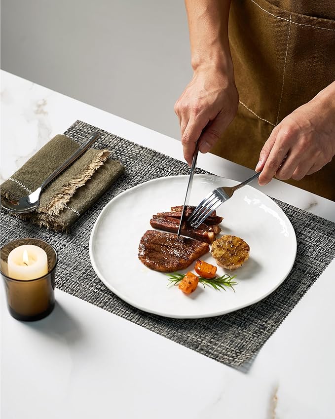 - 【Premium Material & Durability】Crafted from premium white porcelain, this lead-free, cadmium-free, and BPA-free dishes set ensures safe with durability. The high-fired porcelain's weight and thickness resist chipping, scratching, and daily wear, keep the ceramic dinner plates always glossy and durable.