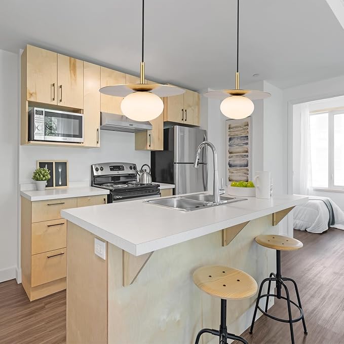 - 【Modern Minimalist Design&Wide Application】This farmhouse pendant light is featuring a milky white glass globe shade under the brushed brass dome,chic and elegant, Ideal for indoors as a dining room pendant light, kitchen island, living room, Restaurant, Bedroom, Dinner Room, Balcony, passageway, Corridors, meeting room, office, bar etc.
