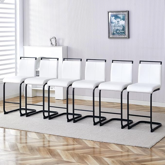 Bar Stools Set of 6,25" Counter Height Bar Stools with Footrest,White Faux Leather Kitchen Stools with Black Painted Metal Leg,White Barstools Ideal for Island Pub Kitchen Counter Dining Chair