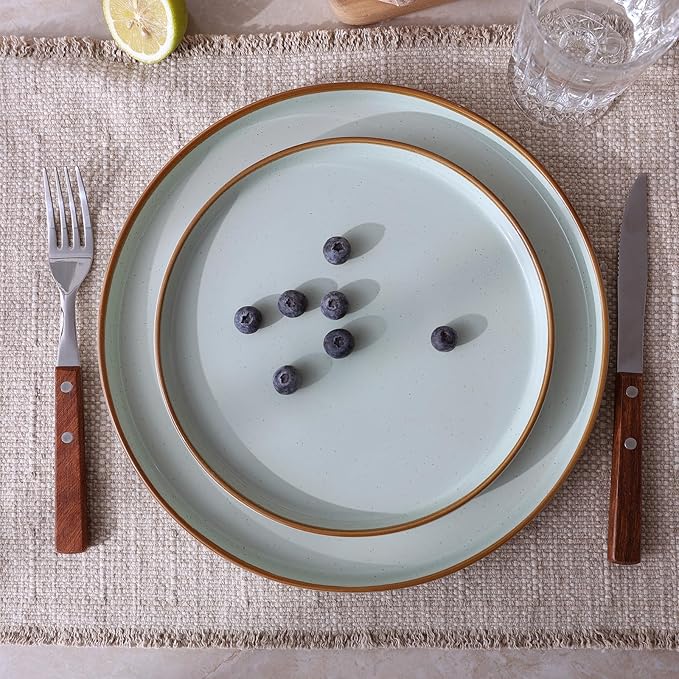 Famiware Nebula Plates and Bowls Sets for 4, 12 Pieces Stoneware Dinnerware Set, Microwave and Dishwasher Safe Dishes Set, Light Green with Brown Rim