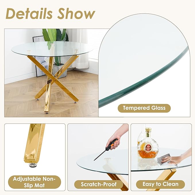 - [Modern Dinner Table Set with Non-slip Foot Mads] This mid century glass dinette set includes 1 table and 4 chairs, and it is charming and suitable for all home styles. Plus, we always insist on high quality products. The plated metal frame matches the non-slip feet we use, which are durable and sturdy, so it must be an ideal furniture choice.