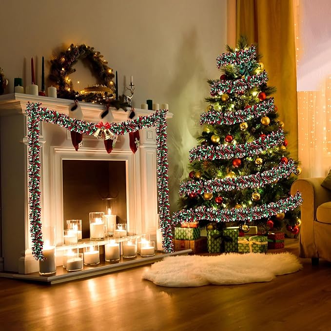 - CHRISTMAS TINSEL GARLAND: Elevate your holiday decor with our 50FT Christmas tinsel garland. Perfect for adding sparkle and festive charm to any space, it creates a warm Christmas atmosphere for gatherings with family and friends.