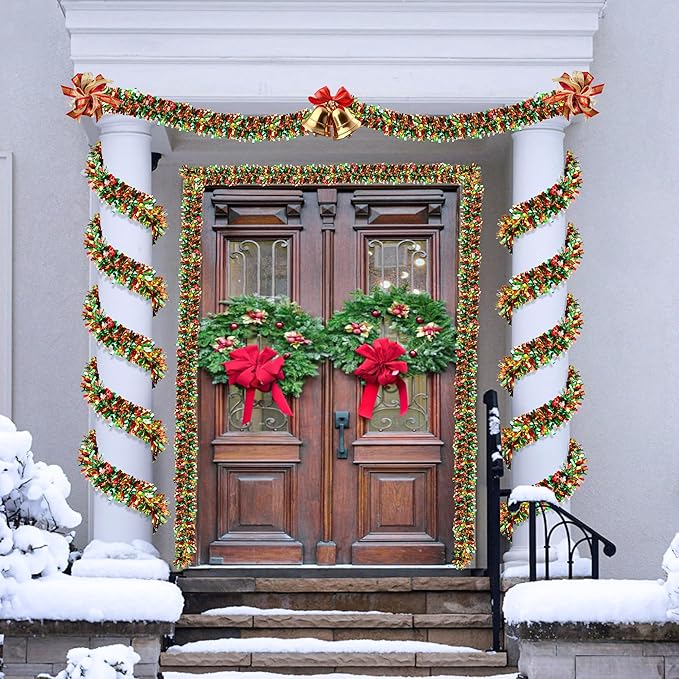 - [ Multiple Applications ]: The Christmas tinsel garland with bright colors and shinning effects can easily beautify your home, Perfect for wrapping and hanging decorations on the xmas tree, mantels, fireplace, stairs banister, windows, ceiling, wall, door on Christmas holiday parties