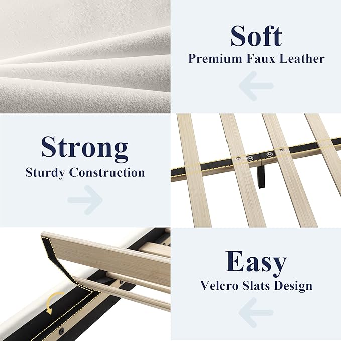 - All-Match Fashion& Comfort: The bed frame is crafted from high-quality faux leather, giving it a sleek look. The design is simple yet elegant, making it a versatile choice for any bedroom decor. The leather material is waterproof and easy to clean.