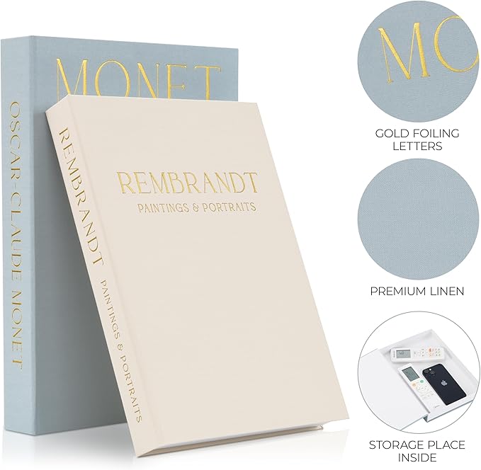 - Embrace Timeless Elegance: Let yourself be whisked away by the smooth charm of the home decor books for a living room & co.! With elegant linen covers & gold lettering as a tribute to famous artists, the books add an enchanting narrative to your shelf decor