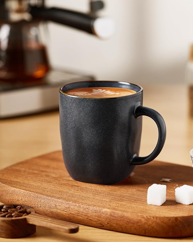 famiware Coffee Mugs Set of 4, Ocean Square 13oz Coffee Cup Set with Handle for Cocoa, Milk, Hot Chocolate, Tea, Water, Stoneware Cups for Kitchen, Microwave and Dishwasher Safe, Matte Black