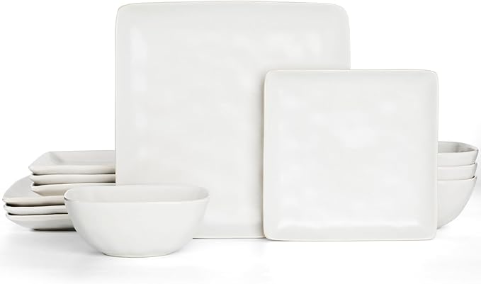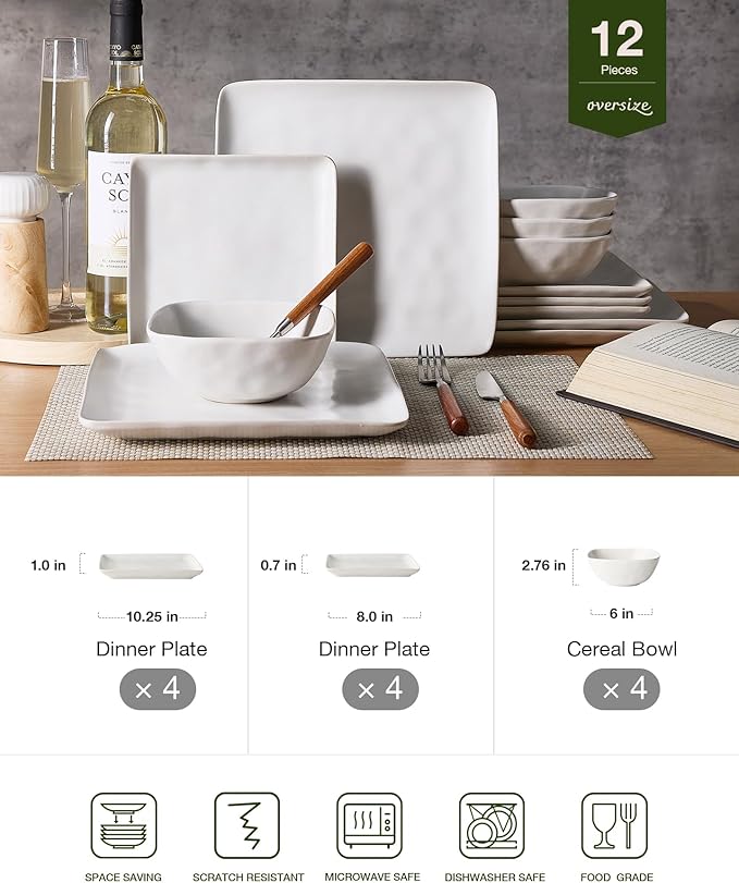Famiware Dinnerware Sets for 4, Ocean Square 12-Piece Kitchen Plates and Bowls Sets, Microwave and Dishwasher Safe, Scratch Resistant, Matte White