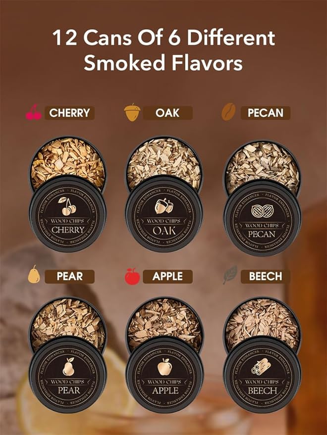- 【12 Flavored Wood Chips】The Whiskey Smoking Kit provides six different flavored wood chips: Cherry, Oak, Hickory, Pear, Apple, and Beech, infusing your drinks with the smooth smoky flavor of natural wood, creating a subtle texture, as well as flavoring wine, meat, cheese, dried fruit, barbecue, and more! There are 2 packs of each type of wood chips in cocktail smoker kit, a total of 12 packs which are durable and perfect for a variety of foods and drinks