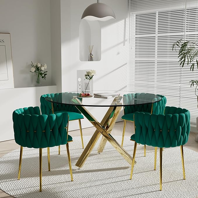 - [Premium & Durable Woven Chairs] This modern dining chair is made of premium velvet fabric with no complicated design, but it is perfect for their plated metal legs and excellent craft, which make the entire kitchen table set stylish and long term service.