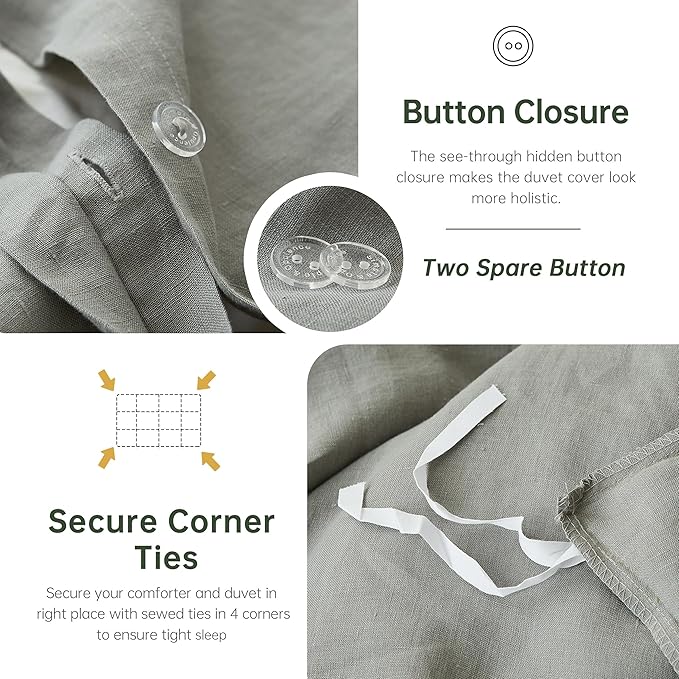 - Thoughtful Details: 4 inner corner straps and hidden button closure ensure a secure fit to prevent the filling from bunching up. The linen bedding set comes with 2 extra spare buttons, no need to worry about unexpected inconvenience.