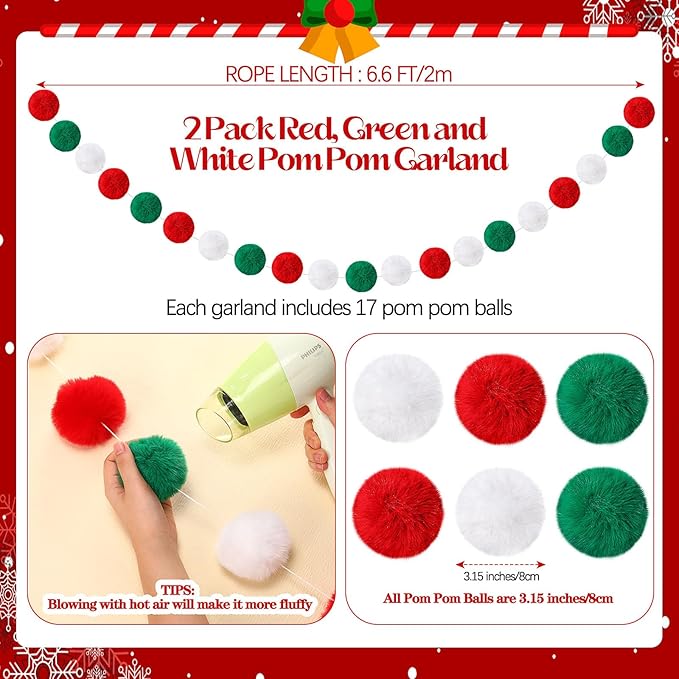 - Generous Package of 2 Christmas Garlands: these 2 Christmas faux fur pom pom garlands in the package give you plenty of decoration for a variety of uses, each garland has about 17 pcs pom poms; These adorable Christmas faux rabbit fur balls, the balls combine to form Christmas pom pom garland, which will really brighten up your Christmas decoration and add more sweet atmosphere to your party