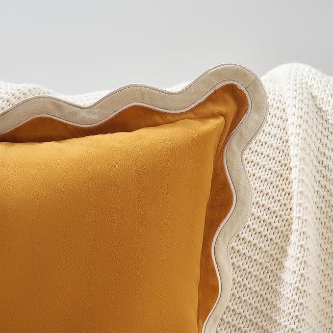 MONDAY MOOSE Decorative Throw Pillow Covers Cushion Cases, Set of 2 Soft Velvet Scalloped Wavy Edge Designs, Mix and Match for Home Decor, Pillow Inserts Not Included (Cream/Honey, 18x18 inch)
