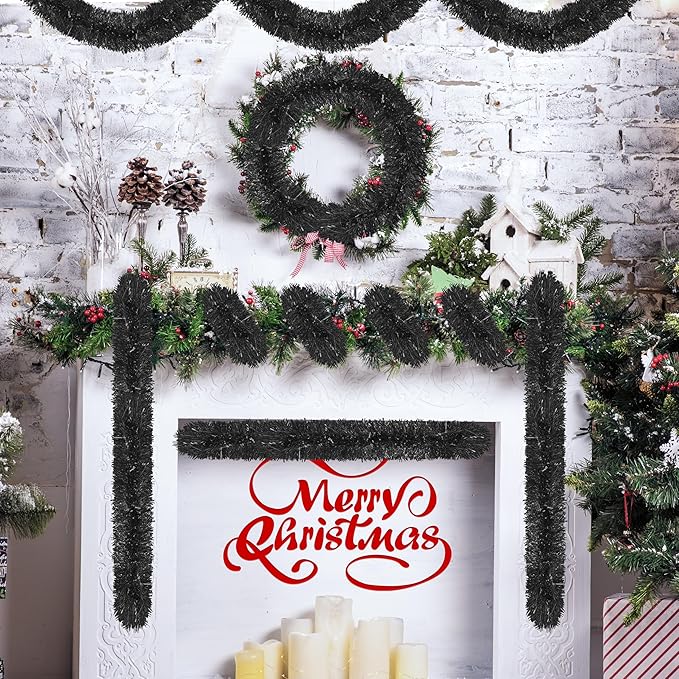 50 Ft Christmas Tinsel Garland Black Thick Tinsel Garland Xmas Tree Decorations Metallic Tinsel Twist Garland for Christmas, Birthday, Party Decor Indoor Outdoor Party Supplies