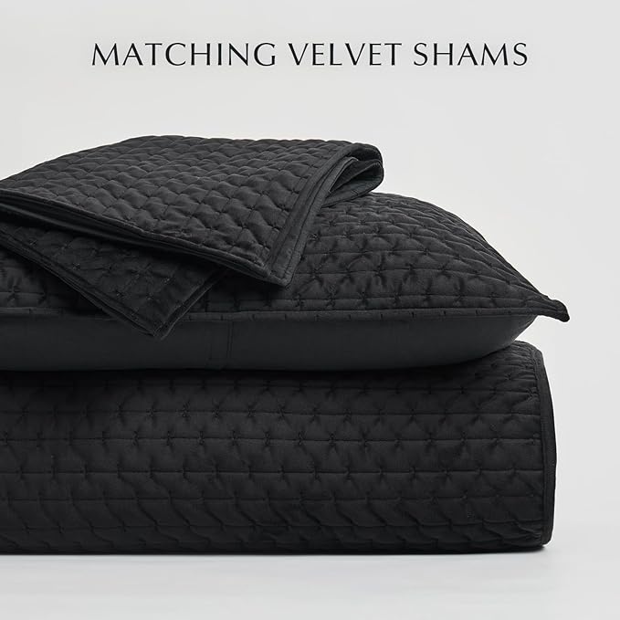 EVERGRACE Luxury Velvet Quilt Bedding Set King Size 3 Pieces with Pillow Shams, Soft Cross-Stitch Velvet Comforter Set, Lightweight Coverlet Bedspread for All Seasons, Black