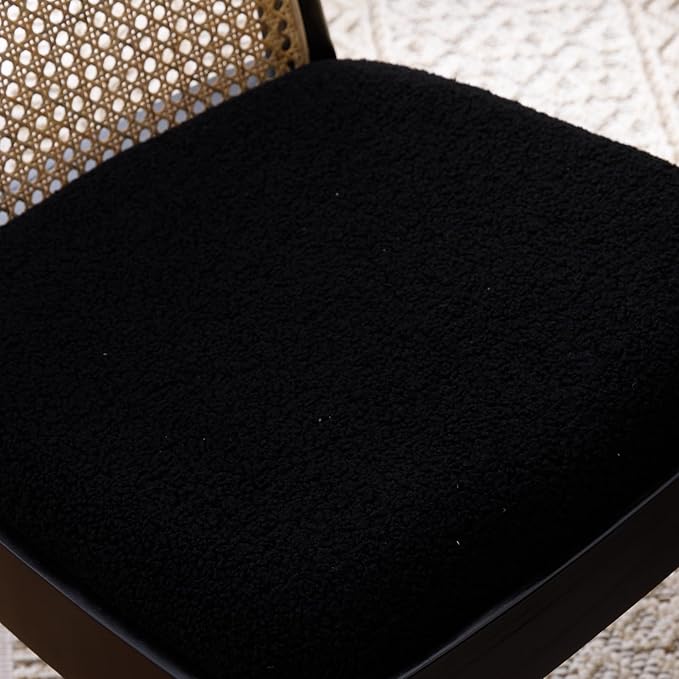 Upholstered Wooden Dining Chairs Set of 4, Farmhouse Kitchen & Dining Room Chairs with Cane Back, Accent Rattan Dining Table Chairs Sherpa Seat for Kitchen/Restaurant/Living Room, Black