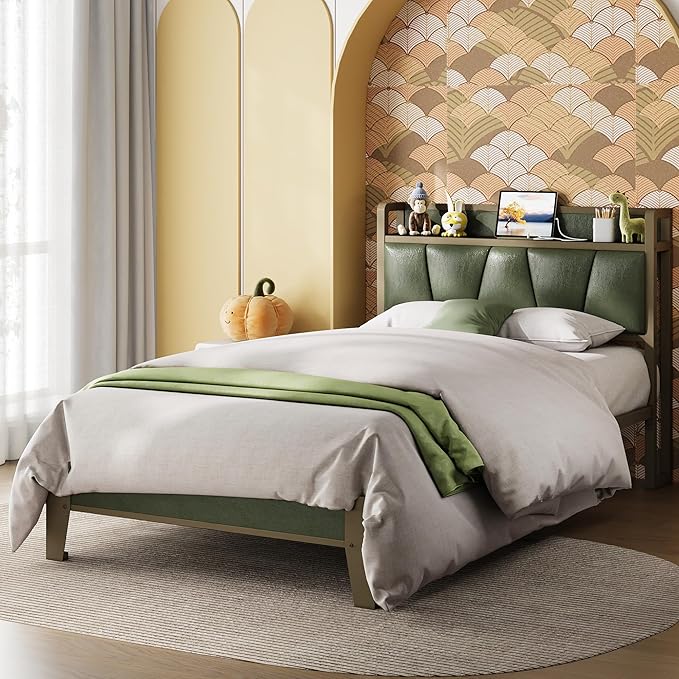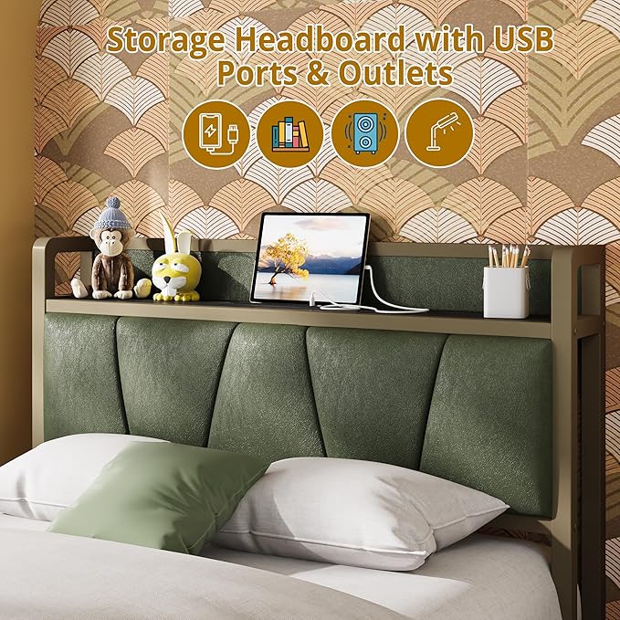 - Practical and Comfortable: Vintage shelf and dark green PU upholstered headboard combine practical and comfortable to match any style of the room