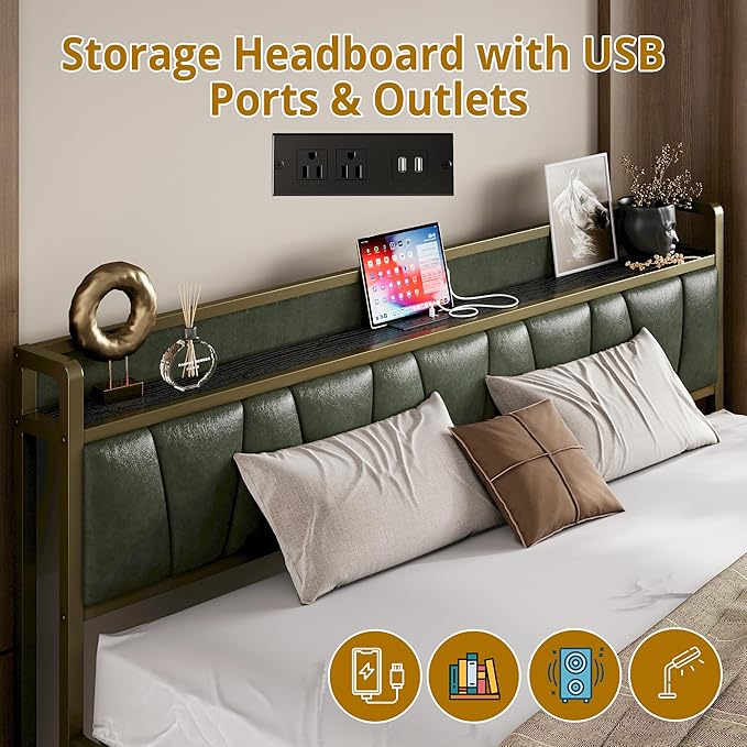LIKIMIO King Bed Frame, Storage Headboard with Charging Station, Solid and Stable, Noise Free, No Box Spring Needed, Easy Assembly (Dark Green)