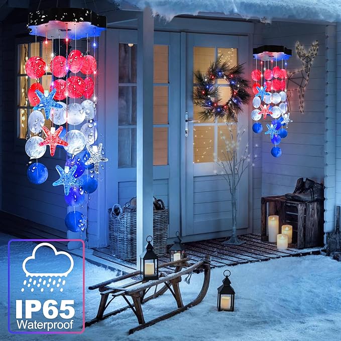 - Waterproof Solar Lights for Outdoor Decor: With IP65 waterproof and unique rain-proof and moisture-proof design, the solar outdoor lights can be hung indoors and outdoors as a lovely day and night decoration. You can enjoy the sight of the Red White Blue shell in the daytime and glowing shell at night.