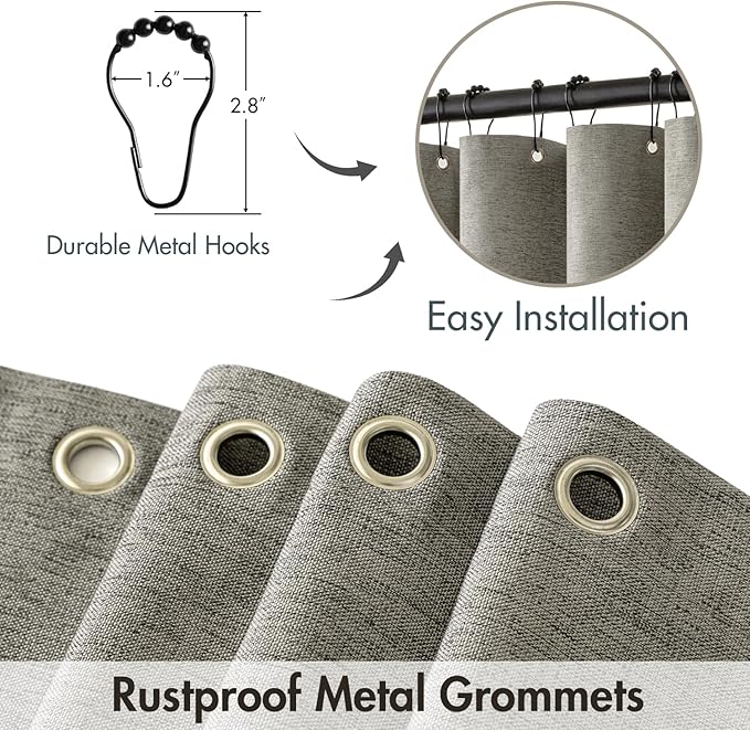 - Package Includes: Comes with 1 faux linen shower curtain featuring reinforced metal holes and 12 bonus metal hooks,rust resistant and easy to slide.You will enjoy the added convenience of these bonus hooks while saving on the cost and effort.