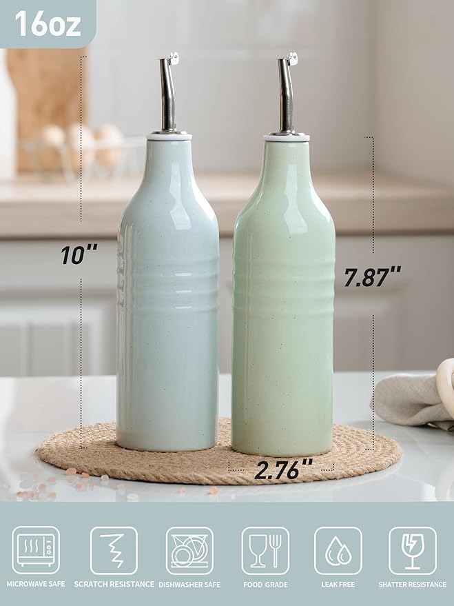 famiware Jupiter 16oz Ceramic Olive Oil Dispenser Bottle, Olive Oil and Vinegar Dispenser Bottle Set of 2 with Stainless Steel Pourers, Suitable for Storage Vinegar, Liquids, Light Blue & Light Green